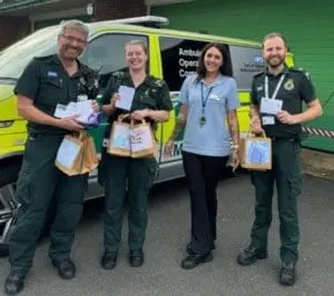 Phil and Kate from the Bedford Ambulance crew were deeply moved, saying, “Thank you, it makes a big difference to be appreciated in this way. It’s lovely to receive this, especially the handwritten notes from the residents .”