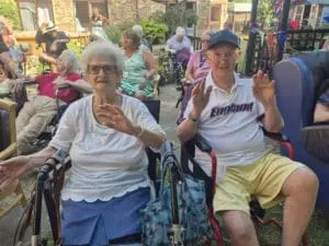 To mark this significant occasion, the home hosted a Vintage Afternoon Tea Garden Party, with the garden beautifully decorated for the celebration. Residents and guests enjoyed a wonderful live performance from the Hereward Ukulele Group, filling the afternoon with music, laughter, and singalongs. Flags were waved, voices were raised in song, and the atmosphere struck the perfect balance of joy and remembrance.