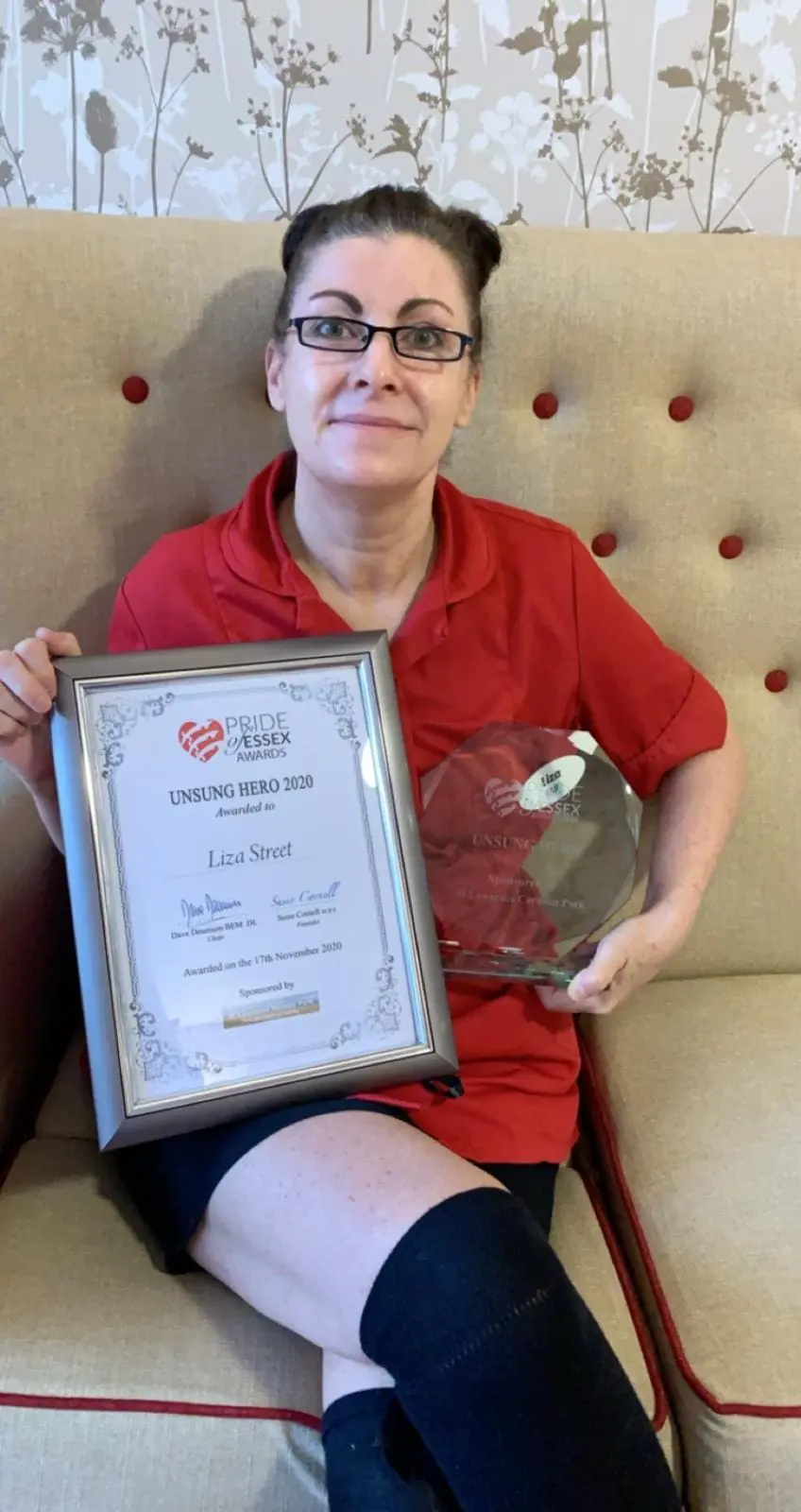 Congratulations and celebrations were held as Queens Court Care Home Activity Co-ordinator Liza Street was awarded the Unsung Hero Award at the 2020 Pride of Essex Awards.