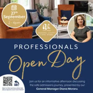 Queens Court Care Home is hosting a Professionals Open Day. Join us for an informative afternoon discussing the safe admissions journey, presented by our General Manager Diana Moraru. Refreshments will be provided. We look forward to seeing you there!