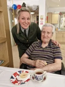 As the decorations were finished, the Lifestyle Team took the opportunity to don their best 1940s outfits. Sarah and Sue dressed as Army girls, while Catherine and Louise embraced the role of Land Girls. When they entered the room, the smiles on the residents’ faces were priceless. “The residents were absolutely delighted when they saw the decorations and our outfits,” said Lifestyle Lead Sarah. “It was wonderful to see their reactions, and their faces lit up as they waved their flags and joined in with the festivities.”